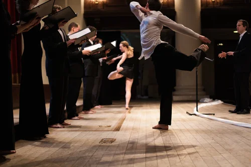 Oliver Reynoldʼs dramatic dialogue is performed by two actors, and centres on two twenty-first-century characters, exploring their relationship with death and hope; their story embodies a narrative arc which takes the audience through the whole performance. While dancers interact with both actors and musicians, Crispin Lewis conducts the period-instrument orchestra of The Musicall Compass, which plays Haydn's music unaltered, but in this re-invented context.